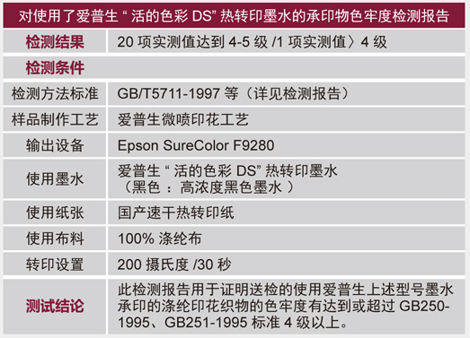 愛普生“ 活的色彩DS” 熱轉(zhuǎn)印墨水不僅擁有寬闊的色域,完全可以滿足數(shù)碼印花行業(yè)中高端用戶對于色彩的需求,而且其承印物的色牢度指標同時達到了優(yōu)異的水平。經(jīng)過國家紡織制品質(zhì)量監(jiān)督檢驗中心檢測,依據(jù)GB 標準,超過95% 以上的色牢度指標達到了4-5 級,不僅實現(xiàn)了可以輸出優(yōu)異的色彩,色彩更可以長久保存。